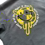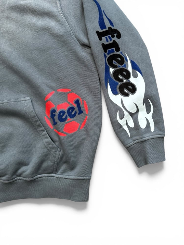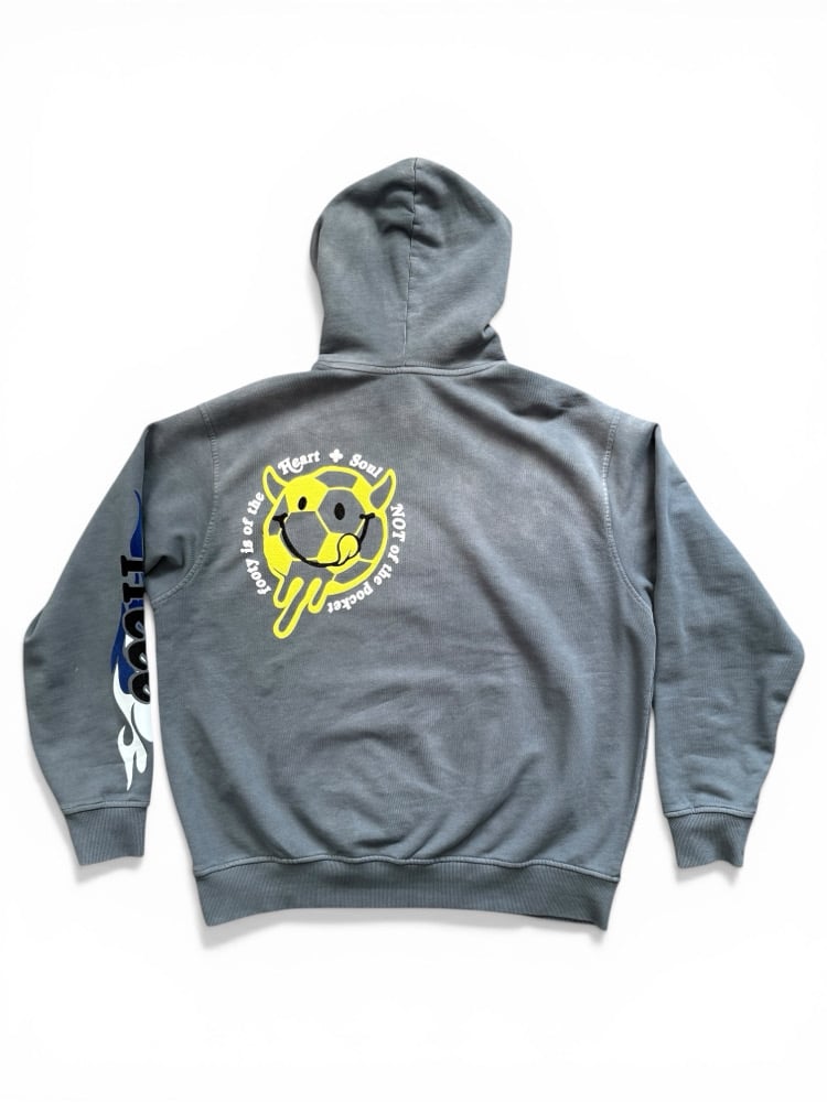 Steel Blue Faded colorway hoodie. Custom details made with varying heat applied vinyl textures including flock and puff.