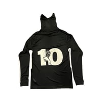 Also there is reference to "Messi" on one of his tracks, who is #10. Another reason for selecting this number for the back. The words "I wanna go to the moon" reference from a track and also GLOWS IN THE DARK. The silhouette of Ye on the back is from his ATL listening party when he was lifted up high above the performance floor. The Graduation Bear coming from Ye's chest is a return or a release of the old Kanye emerging from himself and also I just like the bear. I think its cool.